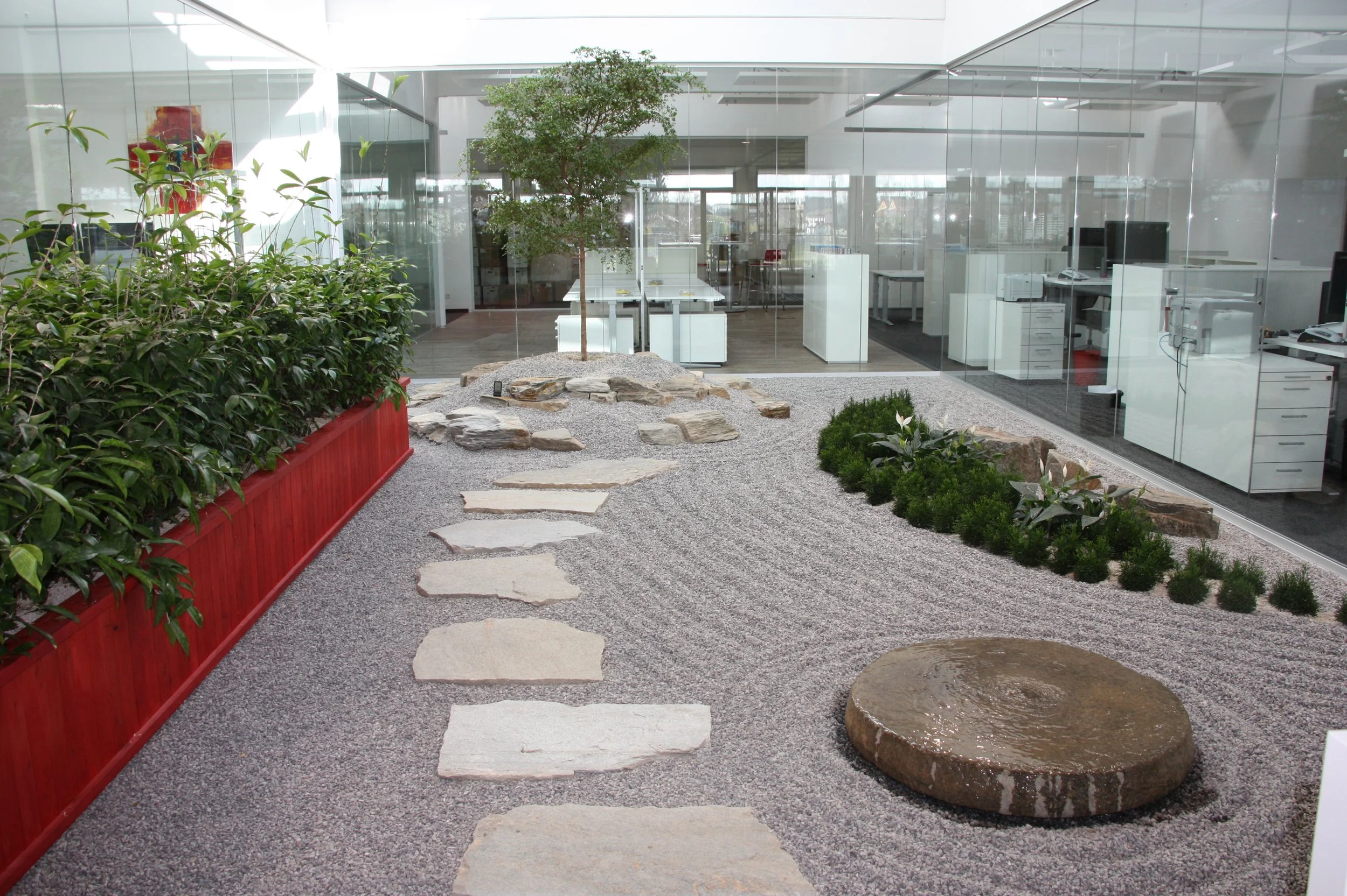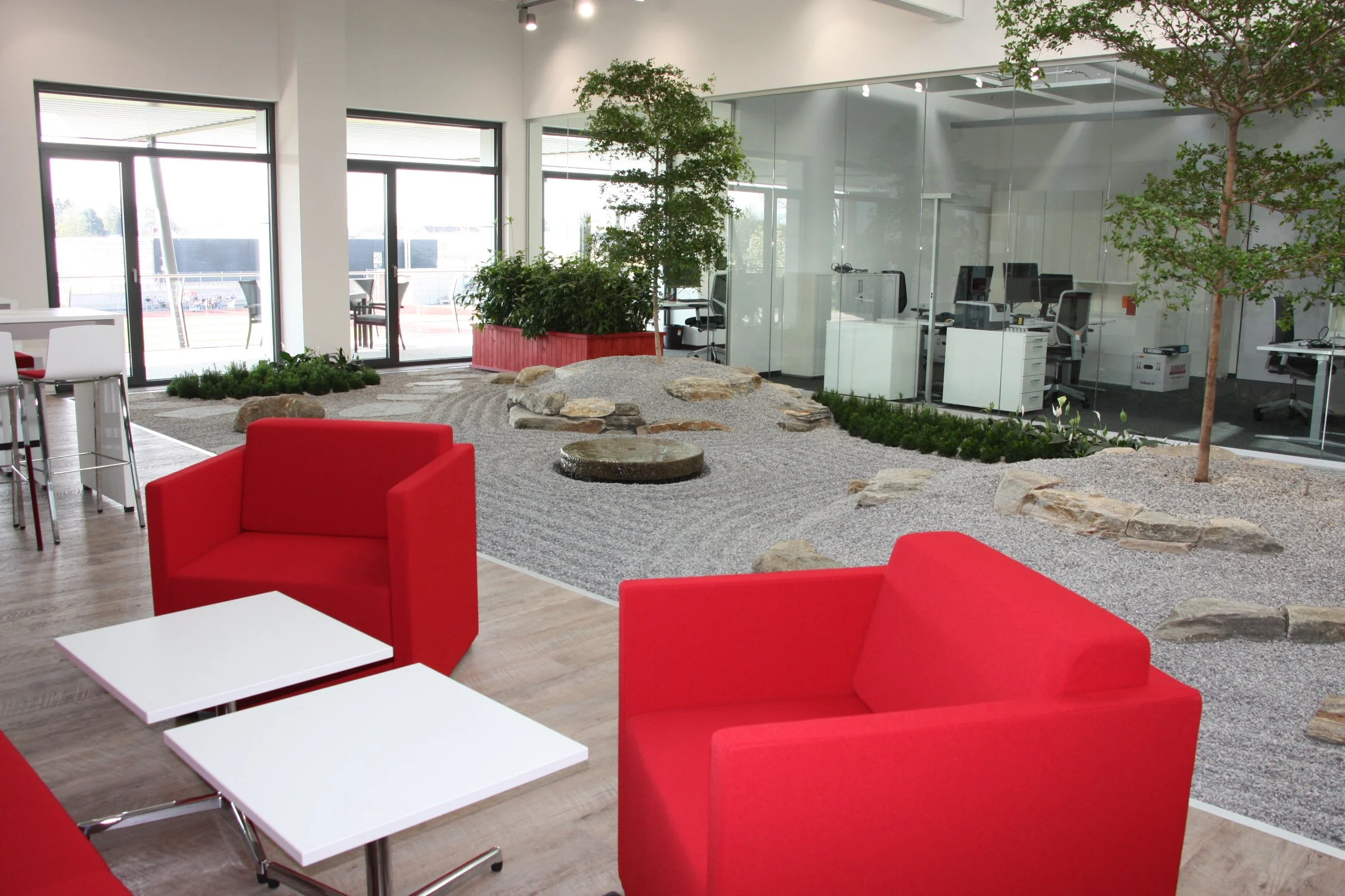 Auch hier erfolgte deshalb eine energetische Kernsanierung, die Implementierung einer neuen Architektursprache, sowie die Umsetzung eines völlig neuen und innovativen Bürokonzepts. Zukünftig betreibt hier die wts Group AG eine ihrer Niederlassungen auf ca. 2.300 qm Fläche. Der neu vorgesetzte Westbalkon bietet Mitarbeitern Erholungsflächen und dient zudem als überdachte Eventfläche. Um den tiefen und nahezu rechteckigen Flächenzuschnitt attraktiv und hell zu gestalten wurden in die Flächen zwei grosse ZEN-Gärten implementiert. Inspiriert von der japanischen ZEN-Philosophie blicken die über Dachfenster erhellten Arbeitsplätze stets auf die ruhigen und begrünten Indoor-Gärten.